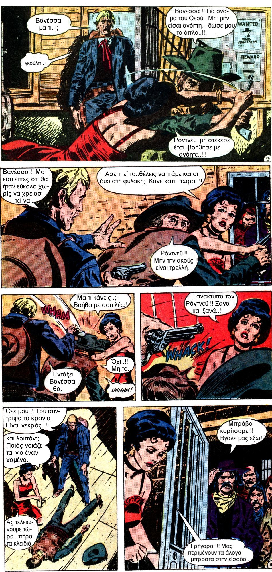 Η δικαστής Χάροου παρ'όλο που είναι γυναίκα είναι πολύ σκληρή και αυστηρή στη δουλειά της. Ο γιός της Ρόντνεϋ είναι μαλθακός, μεθύστακας και αδύνατος χαρακτήρας. Αυτές του τίς αδυναμίες τίς εκμεταλεύται η Βανέσσα. Χρησιμοποιεί τη γοητεία της και με ψέματα τον πείθει να εγληματίσει για χάρη της με το απελευθερώσουν απο τη φυλακή μια συμμορία που ο Τζόνα Χέξ μόλις είχε συλλάβει. Όταν ο Ρόντνεϋ μαθαίνει την αλήθεια είναι πια αργά: η Βανέσσα είναι στη πραγματικότητα ερωμένη του αρχι-συμμορίτη και αυτός δεν ήταν παρά ένα άβουλος που η γοητεία και τα ψέμματα της τον έκαναν πιόνι της και συνεργό στο έγκλημα. Ο Τζόνα Χέξ ξανασυλαμβάνει τη συμμορία. Η αντιπρόσωπος της Δικαιοσύνης που είναι η ίδια η μητέρα του Ρόντνεϋ θα στείλει αυτόν και την Βανέσσα στη κρεμάλα...άλλη μία περιπέτεια του Τζόνα Χέξ. Εδώ βλέπουμε τίς πιο αντιπροσωπευτικές σελίδες της ιστορίας.. |